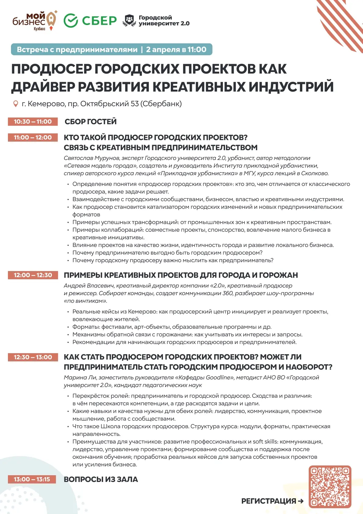 Приходите на встречу «Продюсер городских проектов как драйвер развития креативных индустрий», чтобы узнать, как креативные инициативы меняют города и помогают бизнесу расти. Приглашаем обсудить реальные кейсы и познакомиться с инструментами креативного предпринимательства на очной встрече с экспертами: