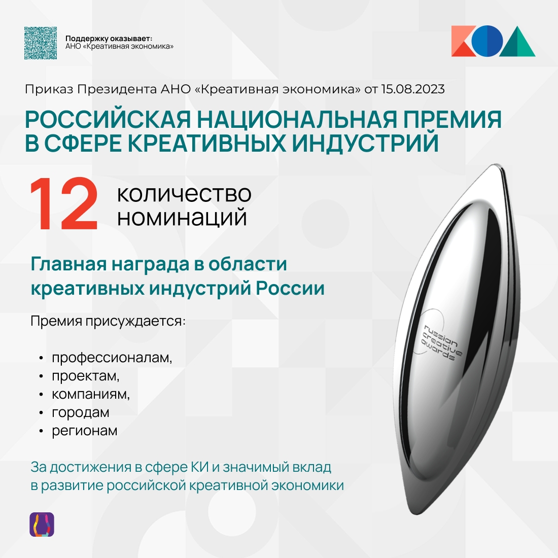 Премия присуждается в 12 номинациях профессионалам, проектам, компаниям, городам и регионам за достижения в сфере КИ и значимый вклад в развитие российской креативной экономики.